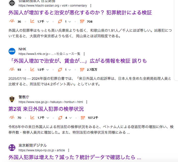 「外国人 犯罪 増加」と検索すると、同様の意見が上位にずらりと並んでいる状況だ