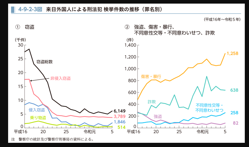 法務省の犯罪白書によると2023年の外国人犯罪者の検挙人数は前年から2600人近くも増えている