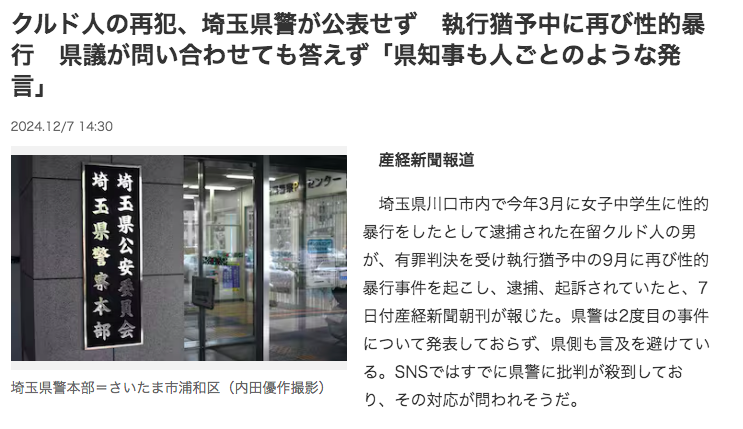 埼玉県警は「外国人による犯罪増加は把握しているが、治安に変化があるほどとは認識していない」と県議会で答弁